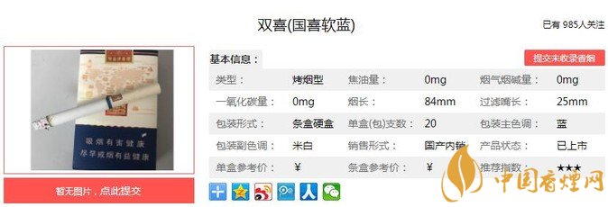 雙喜國(guó)喜軟藍(lán)煙支長(zhǎng)84mm,過濾嘴長(zhǎng):25mm,因?yàn)檫@款是“非賣品”,所以全部為“0”的理化指標(biāo),當(dāng)然這不可能是“0”焦油的,是廠家沒有標(biāo)注具體的理化指標(biāo)而已。