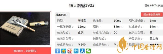 1948年,為慶祝中國恒大企業(yè)公司的成立,東亞煙草廠創(chuàng)立了“恒大”牌香煙,并委托天津華中印刷事務所的著名設計師陳嘉祥設計了“恒大”牌煙標。1956年,恒大煙草廠并入天津卷煙廠。“恒大牌”卷煙成為天津卷煙廠的主打產(chǎn)品。下面就由香煙網(wǎng)小編帶大家一起來了解恒大煙魁1903的相關信息。