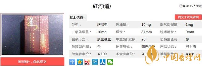 紅河道煙支長(zhǎng)84mm,過(guò)濾嘴長(zhǎng)35mm,煙支造型是不太常見的小方格,煙絲填充飽滿。煙嘴、煙支的包裝工藝都是首屈一指,高端產(chǎn)品的形象一覽無(wú)遺。下面我們一起來(lái)看紅河道的參數(shù)信息:焦油量:10mg 煙堿量:1.0mg 一氧化碳量:10mg