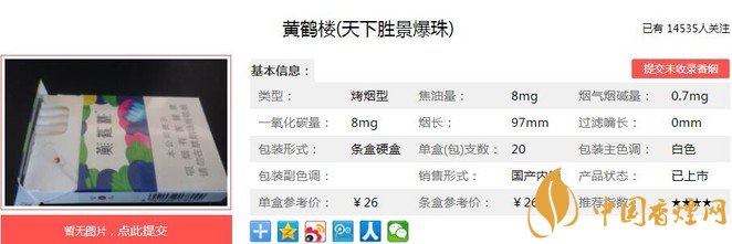 黃鶴樓天下勝景爆珠煙支長97mm,運用中國獨有的木桶薰蒸技術(shù),形成了煙草本香與生姜植物的有機結(jié)合。下面我們一起來看黃鶴樓天下勝景爆珠的參數(shù)信息:焦油量:8mg 煙堿量:0.7mg 一氧化碳量:8mg