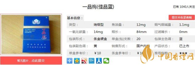一品梅佳品藍香煙曾經(jīng)是很多人心中的經(jīng)典,香氣豐富飄逸,煙氣柔和,吸味醇和,余味純凈舒適,回味甜感。很多人稱它藍一品,在煙民心中的地位很不錯,但目前已經(jīng)很難找到了。經(jīng)香煙網(wǎng)小編市場調(diào)查一品梅佳品藍售價為10元/包。