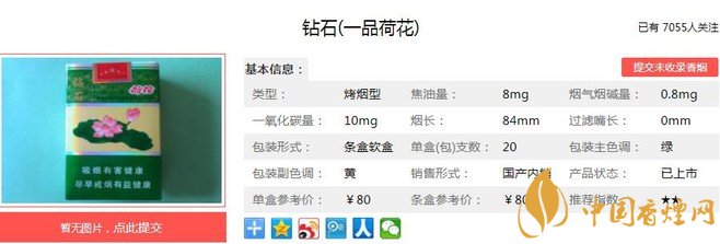 鉆石一品荷花于2014年上市,在高端卷煙市場(chǎng)占用很大的份額,濃淡適中的香氣,勁頭適中成為很多人的口糧。清雅脫俗的包裝設(shè)計(jì)更讓人愛不釋手,經(jīng)香煙網(wǎng)小編市場(chǎng)調(diào)查鉆石一品荷花售價(jià)為80元/包。