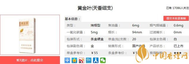 黃金葉天香細(xì)支類(lèi)別為“高一類(lèi)A(細(xì)支)潛力規(guī)格”,烤煙類(lèi)型。外包裝沿襲天葉低調(diào)奢華的品系風(fēng)格,一如既往的黃金標(biāo)準(zhǔn),一絲不茍的手捻精神,和大小天葉系列一脈相承,據(jù)香煙網(wǎng)小編市場(chǎng)調(diào)查它的零售參考價(jià)為55元/包。