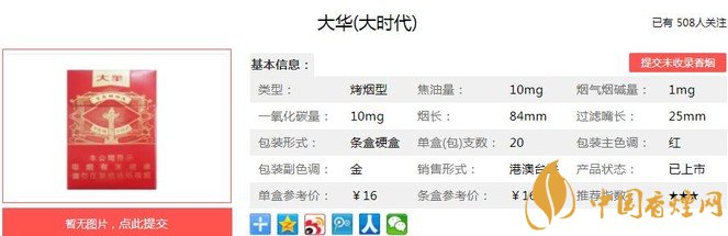 臺(tái)灣制造,取材自然,配方考究,工藝精湛,原料甄選自南緯23° 以北和北緯23°以南世界級(jí)優(yōu)質(zhì)名產(chǎn)區(qū)出產(chǎn)的優(yōu)質(zhì)烤煙煙葉,煙氣醇和飽滿,煙香細(xì)膩豐富,口感純正,三香合一。經(jīng)香煙網(wǎng)小編市場(chǎng)調(diào)查大華大時(shí)代售價(jià)為16元/包。