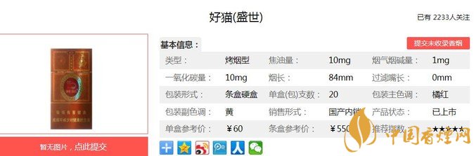好貓盛世以高香低危害為主要設(shè)計(jì)方向,主要原料精心選用自然醇化兩年以上的云南、津巴布韋煙葉,突出產(chǎn)品優(yōu)雅的清香,煙香豐富諧調(diào)。在香料配方中首次采用具有生物減害技術(shù)的中草藥“豐和液”,使有害氣體得以轉(zhuǎn)移降解,達(dá)到了“生津不起痰,回甜不口干”的良好效果。經(jīng)香煙網(wǎng)小編市場調(diào)查好貓盛世售價為60元/包。