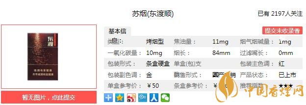 蘇煙東渡順煙支長84mm,過濾嘴長36mm,深棕的過濾嘴上有一條降焦線,字體較大的東渡字樣,以及與煙盒底部相同的印章順字印制于過濾嘴紙上的兩側(cè)。金色水松紙上印制的是一帆風順字樣,完全呼應了煙盒背面帆船的設(shè)計。下面我們一起來看蘇煙東渡順的參數(shù)信息:焦油量:11mg 煙堿量:1.0mg 一氧化碳量:10mg