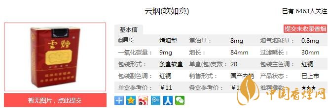 云煙軟如意產品類型:烤煙型、焦油量:8mg、煙堿量:0.8mg、一氧化碳量:9mg、包裝形式:條盒軟盒(每盒 20 支,每條 10 盒)、煙支規(guī)格:84mm。