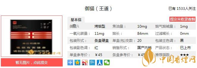 成熟、渾厚、自然的煙草本香結(jié)合甜香韻、果香韻、花香韻和酒香韻,協(xié)調(diào)統(tǒng)一,自然天成。煙香成熟、優(yōu)雅、厚實、純凈、細(xì)膩、豐富;吃味飽滿、純凈、自然;回味津潤、回甜、舒適、干凈。經(jīng)香煙網(wǎng)小編市場調(diào)查御貓王道售價為45元/包。