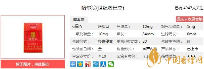 哈爾濱老巴奪煙支長(zhǎng)84mm,過(guò)濾嘴長(zhǎng)25mm,使用從植物中提取的天然香原料和天然植物保潤(rùn)技術(shù),保證卷煙舒適感;以清甜香風(fēng)格為基礎(chǔ),采用創(chuàng)新性中支(7.0mm)規(guī)格,在保證滿(mǎn)足感前提下,注重?zé)熛愕拇己透小⑹孢m感和甜潤(rùn)感,同時(shí)兼顧卷煙安全性。下面我們一起來(lái)看哈爾濱老巴奪的參數(shù)信息:焦油量:10mg 煙堿量:1.0mg 一氧化碳量:10mg