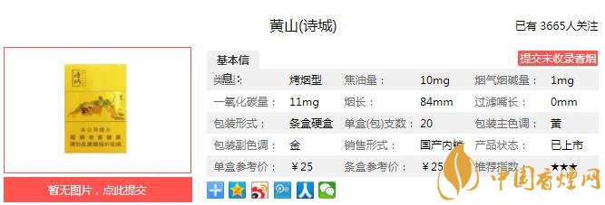 黃山詩(shī)城煙支長(zhǎng)84mm,過(guò)濾嘴長(zhǎng)25mm,濾嘴構(gòu)造簡(jiǎn)單,沒(méi)發(fā)現(xiàn)有激光打孔等形式的降焦手段。卷紙為豎條紋造型,煙葉填充較為飽滿(mǎn)。。下面我們一起來(lái)看黃山詩(shī)城的參數(shù)信息:焦油量:10mg 煙堿量:1.0mg 一氧化碳量:11mg