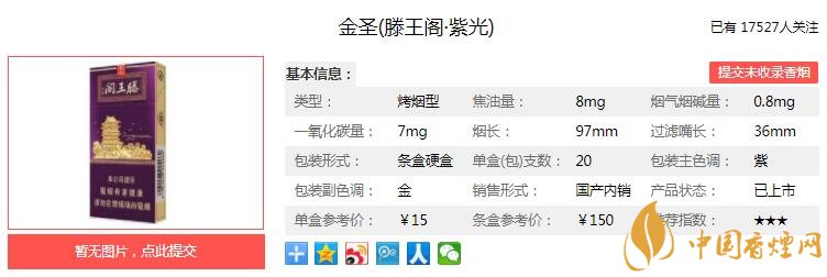 古樸的牌匾與滕王閣金箔畫交相輝映、相得益彰,充分展現(xiàn)了獨(dú)特的江南名樓形象,包裝設(shè)計(jì)精美大氣??Х认銡馇逖?,煙氣綿柔醇和,口感順暢細(xì)膩,回味甘香生津。經(jīng)香煙網(wǎng)小編市場調(diào)查金圣滕王閣紫光售價(jià)為15元/包。