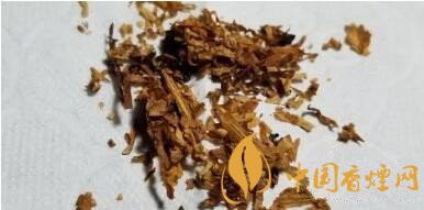 攤開煙絲,油潤紅亮,棕黃色自然陳化的烤煙原片絲占據(jù)80%的比例,間雜有切寬稍細(xì)的深棕色煙絲,煙梗則切得極薄,一般長度在6-7mm左右。用料比較厚道實在。