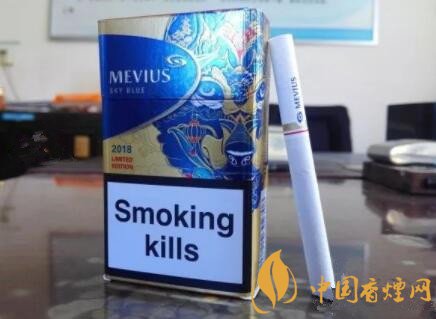 我們首先來看一看煙盒的整體包裝設計情況。柔七的LOGO自不必多言,它的下方印有“SKY BLUE”字樣,意指“天藍”或者“藍天”款式。歐盟樣式的黑色粗警示框的上方,同時印有“2018 LIMITED EDITON”字樣,意為“2018限量款”。