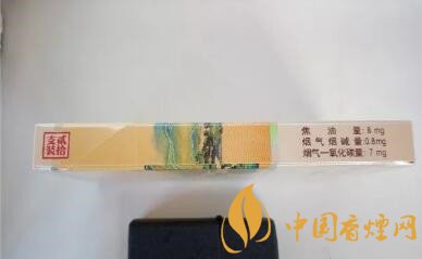 煙盒的左側(cè)連貫著圖案,下面是這款煙的理化指標(biāo):焦油量:8mg、煙氣煙堿量:0.8mg、煙氣一氧化碳量:7mg等,在左側(cè)上方還有類(lèi)似印章一樣的正方形紅色字體,標(biāo)明內(nèi)有貳拾支裝。