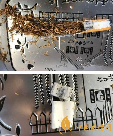 出于好奇,把其中的一根進(jìn)行了分尸??梢钥吹接袃啥芜^(guò)濾嘴,一段加了活性炭,一段就是普通的過(guò)濾嘴。