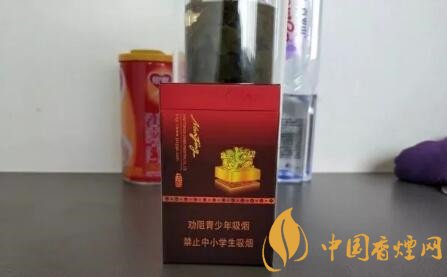 盒子的中間,一顆金黃色的玉璽,顯示了它的尊貴的身份,玉璽圖案的右邊是一枚仿古的印章,內(nèi)有“古都”兩個(gè)字,在圖案的下面是好像是一條鑲著寶石的腰帶。煙盒下面三分之一的面積,按照慣例還是警示語(yǔ)標(biāo)識(shí),警示語(yǔ)為本公司提示版,屬于比較新的一款。