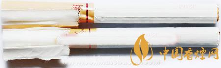 側(cè)面包裝和拉線頭差異對比:真品卷煙包裝時內(nèi)襯紙明顯長于商標(biāo)紙,拉線頭為規(guī)則半橢圓形、且邊緣光滑,電話號碼“8008571056”字體筆畫較細(xì);假煙包裝時內(nèi)襯紙和商標(biāo)紙基本上相平,拉線頭形狀不規(guī)則,且邊緣較粗糙,電話號碼“8008571056”字體筆畫較粗,與真品特征存在明顯差異。