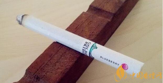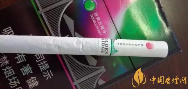 國產(chǎn)爆珠香煙金橋煙支上一道綠箍,一座綠色的金門大橋坐落其上,暗示了這包煙即使不爆珠也自帶的涼味。水松紙上有爆珠示意圖,靠唇端是紫紅色的藍(lán)莓,靠煙絲端是翠綠色的薄荷。又要用圓點(diǎn)顯示爆珠位置,又要用英文字母標(biāo)注爆珠口味,如果同處一側(cè)將顯得擁擠,因此二者分居濾嘴兩側(cè)錯開。煙支上沒有漢字,GOLDEN BRIDGE、BLUEBERRY和COOL MINT,營造出了外煙的既視感。