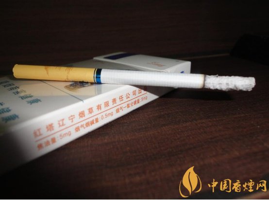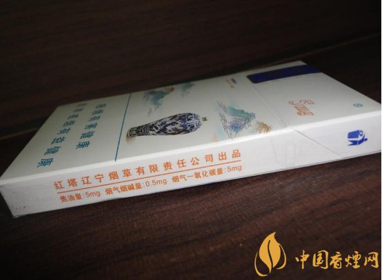 煙盒的右側(cè)注明了理化數(shù)值,紅塔遼寧煙草有限責(zé)任公司出品方名稱,焦油量:5mg、煙氣煙堿量:0.5mg、煙氣一氧化碳量:5mg,還印有顯眼的深藍(lán)色環(huán)保標(biāo)識。