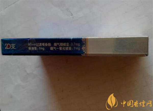 煙盒右側標注著香煙的理化數(shù)值,標注著過濾嘴香煙長97mm,0.7mg煙氣煙堿量,7mg焦油量,7mg煙氣一氧化碳量,印有主品牌單位名稱,數(shù)量指標20支。