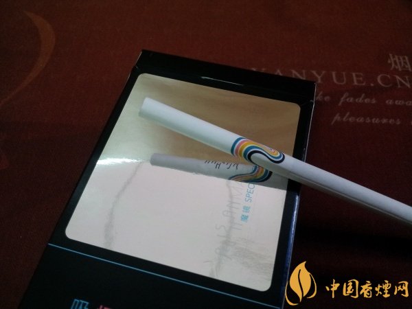 煙支通體純白,白到卷煙紙上連豎的或是橫的紋理都沒有。白色的水松紙上除了阿里山的Logo外,還飄蕩著一條“藍(lán)白紅白黃白藍(lán)白黑”的“幾”字形絲帶,很是奪目。