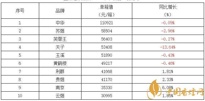 重點(diǎn)卷煙品牌2017年結(jié)構(gòu)增長率前10排序表