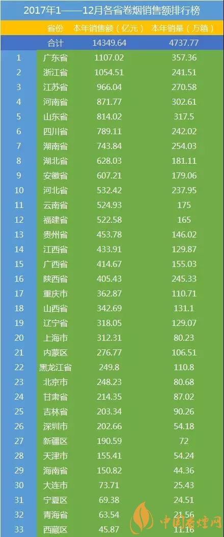 最新中國(guó)香煙銷量排行榜前10名 各省香煙銷售額排行榜2017(30省)
