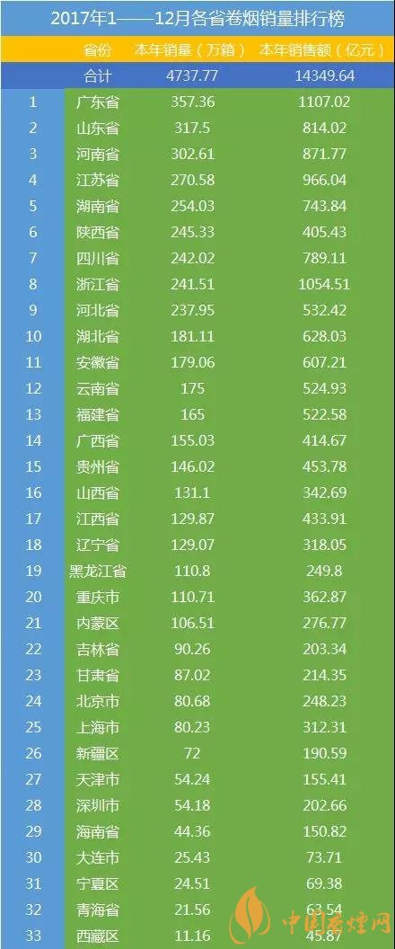 以上就是香煙網(wǎng)小編為大家整理介紹的關(guān)于中國(guó)香煙銷量排行榜前三十名以及2017各省香煙銷售額排行榜。更多了解點(diǎn)擊:2017銷量最好的煙是什么 重點(diǎn)品牌香煙銷量排行榜表2017前10名
