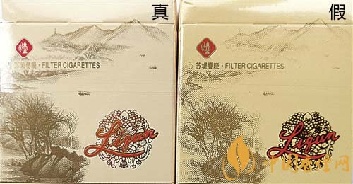 真品商標(biāo)紙采用膠印印刷,中間“利群”文字及拼音采用壓凸?fàn)C金工藝,用手摸凹凸感明顯,“蘇堤春曉”主體圖案顏色較深;假煙采用高清掃描仿制印刷,中間“利群”文字及拼音用手摸無(wú)凹凸感,“蘇堤春曉”主體圖案顏色較淡,商標(biāo)紙整體顏色偏黃。