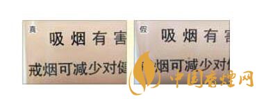 真煙警示語(yǔ)印刷字的邊緣干凈,商標(biāo)紙底色色原點(diǎn)為點(diǎn)狀微小顆粒,印刷細(xì)膩,如警示語(yǔ)第一個(gè)“吸”字的最后一筆捺,起筆點(diǎn)是平頭狀;假煙警示語(yǔ)印刷字的邊緣有均勻的鋸齒狀虛邊,商標(biāo)紙底色色原點(diǎn)為不規(guī)則的點(diǎn),顆粒大,印刷不均勻且粗糙,如警示語(yǔ)第一個(gè)“吸”字的最后一筆捺,起筆點(diǎn)是尖頭狀。