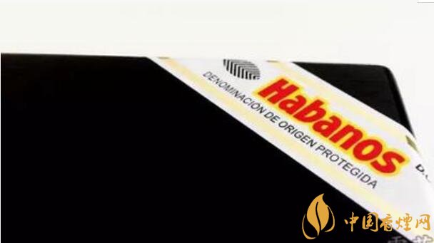 紅色粗體的“Habanos”被黃色描邊加亮,左邊是黑色條紋的煙草葉圖案,頂端和底部是二條金色的粗線條,在標(biāo)簽底部印有DENMOINACION DE ORIGEN PROTEGIDA字樣,代表受保護(hù)的原產(chǎn)地名稱。在標(biāo)簽的右上角還有一個D.O.P.,是原產(chǎn)地保護(hù)的縮寫。這個標(biāo)簽應(yīng)該是最不容易被忽略的Habanos標(biāo)志了。
