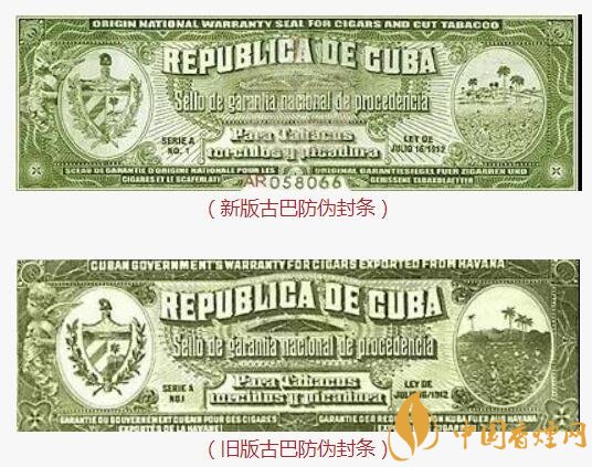 另外,在紫外線的照射下,封條的中間會出現(xiàn)一個粉紅色水印,它其實是古巴共和國國徽。在紫外線下同時出現(xiàn)的,還有防偽序列號,就是上圖中的XX603385字樣。
