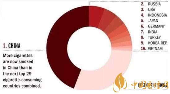 中國是世界上最大的煙草消費和生產(chǎn)國,中國每年的煙草消費量相當(dāng)于排名第2-29位的所有國家煙草消費量的總和。全世界每年超過三分之一的煙草是中國人消費的。