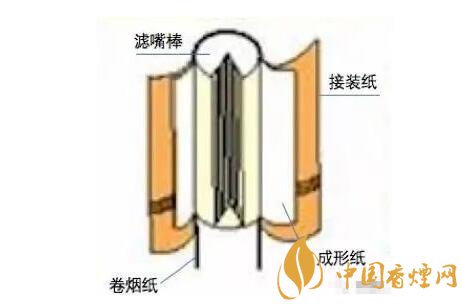 空腔濾嘴:空腔濾嘴是屬于二元復(fù)合濾嘴的一種,二元復(fù)合濾嘴通常是一段濾材為醋酸纖維,另一段為皺紋紙或生產(chǎn)過(guò)程中摻入添加劑(如活性炭)的醋酸纖維??涨粸V嘴是屬于后端為皺紋紙的那種,因?yàn)楹蠖藶橹锌?,為了不使其塌陷,而醋酸纖維太軟,所以利用皺紋紙做成中空型。因其有一段規(guī)則的空腔, 形成一個(gè)低壓通道,抽吸時(shí)吸阻小, 能夠顯著提高對(duì)煙氣中焦油的過(guò)濾效率,有效地減少焦油和一氧化碳的釋放量。