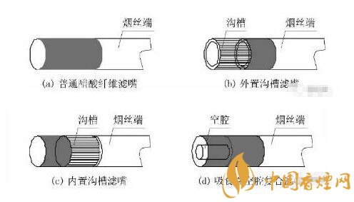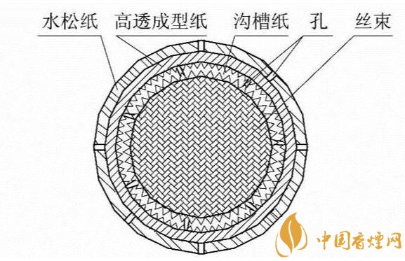 溝槽濾嘴:是一種由于特殊結(jié)構(gòu)的溝槽純纖維紙包囊醋酸纖維絲束濾芯制成。簡(jiǎn)單來(lái)說(shuō),就是在醋酸濾芯的外圍先包覆一層溝槽纖維素紙,然后包裹一層成形紙而成。溝槽纖維素紙的表面是通長(zhǎng)的溝槽段或者是溝槽段和平坦段組合構(gòu)成。其作用一方面可以有效減小吸阻提高通透感。另一方面增大煙氣與濾嘴的接觸的表面積,快速降低煙氣溫度和增加對(duì)煙氣有害物質(zhì)的過(guò)濾和吸附。