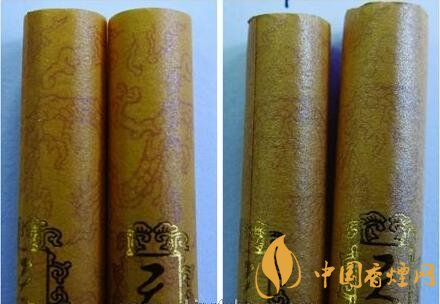 真品小盒商標(biāo)紙圖案樣式借鑒乾隆年代的皇家御用器盒,名為“海水江崖云龍”圖樣,有“龍飛在天,福澤天下”的吉祥寓意,采用雕刻激光定位燙金印刷工藝,圖樣呈現(xiàn)出凹凸有序,層次分明的立體感,真品印刷工藝細(xì)致,圖樣及字體清晰完整無(wú)缺;假煙采用仿照技術(shù),圖樣印刷工藝粗糙,脫漆掉色漏印明顯,與真品印刷工藝存在明顯差異。