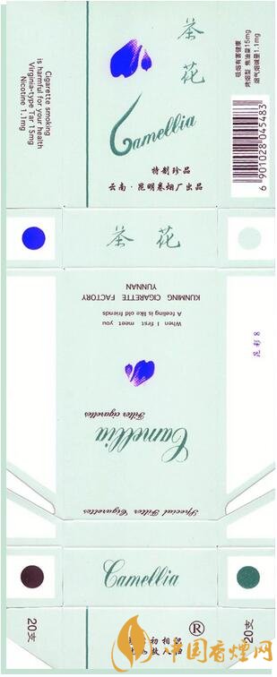 1998年昆明卷煙廠出品。“茶花”牌卷煙創(chuàng)牌于1975年,茶花是云南特有的名花,也是昆明市的市花。1975年昆明卷煙廠用英國引進(jìn)的全國煙草行業(yè)第一臺(tái)過濾嘴卷煙設(shè)備,生產(chǎn)云南第1包過濾嘴香。1976年,首批銷往香港,開創(chuàng)中國過濾嘴卷煙出口創(chuàng)匯先河。