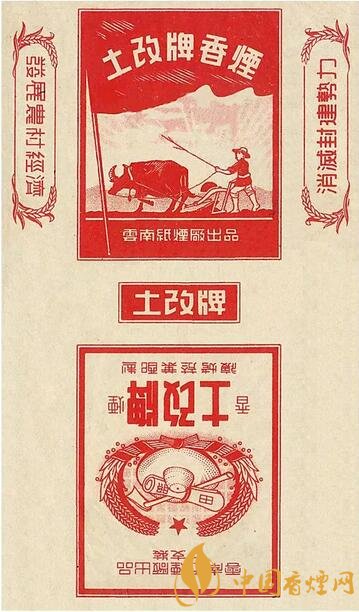 1951~1952年云南紙煙廠出品。主圖為農(nóng)民駕耕牛犁田,副圖為草帽鋤頭麥穗圍成紅色圖案,“發(fā)展農(nóng)村經(jīng)濟(jì)、消滅封建勢力”字樣,表現(xiàn)農(nóng)民第一次成為土地的主人,在田間精心勞作形象。1950年云南和平解放,1951年開展大規(guī)模的土地改革運(yùn)動(dòng)。該煙標(biāo)是中國煙標(biāo)史上少見的“土改”牌煙標(biāo)。
