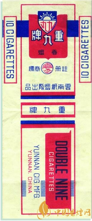 1945年,云南紙煙廠出品。創(chuàng)牌于1922年,為紀(jì)念護(hù)國名將蔡鍔等所領(lǐng)導(dǎo)的“重九起義”而創(chuàng)牌,重九牌歷史悠久,具有豐富的文化內(nèi)涵,是云南紙煙廠的榮譽(yù)產(chǎn)品。該牌號(hào)卷煙僅生產(chǎn)13.85箱,屬罕見珍貴煙標(biāo),具有歷史文物價(jià)值。1945年6月1日云南紙煙廠在昆明金碧日?qǐng)?bào)刊登“重九”牌更換商標(biāo)紙盒啟示 , 以此啟示為證改寫了此枚珍貴歷史商標(biāo)的確切生產(chǎn)時(shí)間。