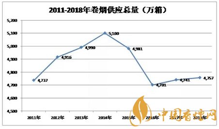 2018年,全國(guó)卷煙總銷量為4757萬(wàn)箱,已經(jīng)超過(guò)了2011年卷煙供應(yīng)總量(4737萬(wàn)箱)。但是,其中細(xì)支卷煙銷售203萬(wàn)箱,按1/1.5粗細(xì)換算后,相當(dāng)于行業(yè)向市場(chǎng)供應(yīng)了4641萬(wàn)箱常規(guī)卷煙。這就遠(yuǎn)遠(yuǎn)小于2011年的行業(yè)卷煙供應(yīng)總量了。