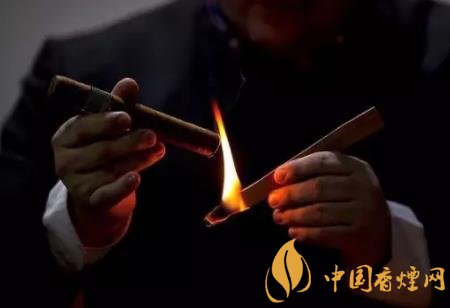 雪茄煙翻開一端(尾部)是點著的一端,不要將尾部直接放在火焰上,也不要先將雪茄放在嘴里。應當先用手拿住雪茄,將尾部以45°角接近火源一英寸處,這么做的意圖是為了預熱或是將煙灸熱以保證雪茄能充沛、均勻的點著。在灸燒時旋轉一下雪茄,當雪茄煙尾部已均勻加熱,變得焦黑和發(fā)亮時,將雪茄置入口中。