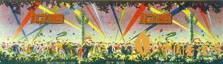 而貴陽煙草公司出品于上世紀50年代的“祖國”煙標(圖4),主版采用明快色調,描繪出了新中國成立后人民當家作主的喜悅之情:只見各族人民身著節(jié)日盛裝,在彩球飄飄、五顏六色的射燈光柱直射天空背景襯托下,聚集于天安門前的華表周圍,在撼天動地的鼓樂聲中載歌載舞,盡情地歡慶新中國的誕生。