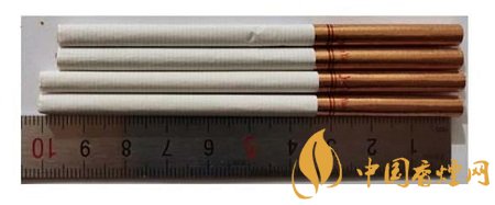 真品卷煙:煙支長度為100mm,濾嘴處有四排激光預(yù)打孔,打孔透氣度好。卷煙紙顏色白,手摸煙支飽滿緊實(shí),搭扣處結(jié)合完美。煙絲呈現(xiàn)絲條狀,色澤基本一致。