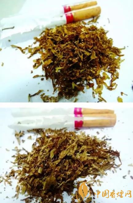 假煙煙絲顏色淡黃,煙絲成分粗劣,煙梗比摻雜多,碎末多,其煙絲結(jié)構(gòu)配比與真品存在顯著差異。(上真下假)