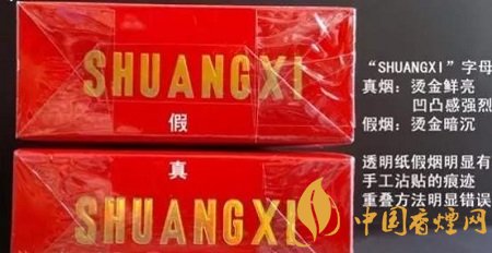 4、看盒煙頂部的“SHUANGXI”字樣:真品雙喜硬經(jīng)典香煙“SHUANGXI”字母燙金鮮艷,凹凸感明顯。且封口處粘合形狀規(guī)則;而假煙“SHUANGXI”字母燙金暗沉,凹凸感不明顯。而且封口處有明顯手工粘貼痕跡,粘合形狀不規(guī)則。