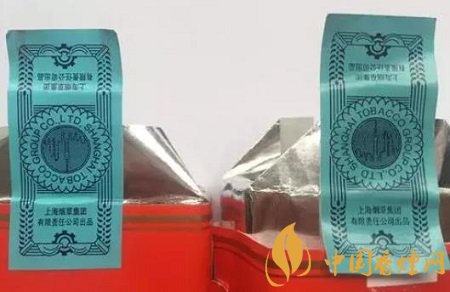 真品卷煙的封簽紙印刷清晰、細膩,中間的東方明珠塔尖指向正面;假煙封簽紙印刷模糊、粗糙,中間的東方明珠塔尖指向背面。