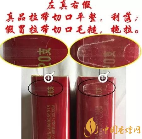 左真右假,真品的拉帶切口比較平整,利落;而假冒的香煙拉帶口就比較粗糙毛躁,拖拉。