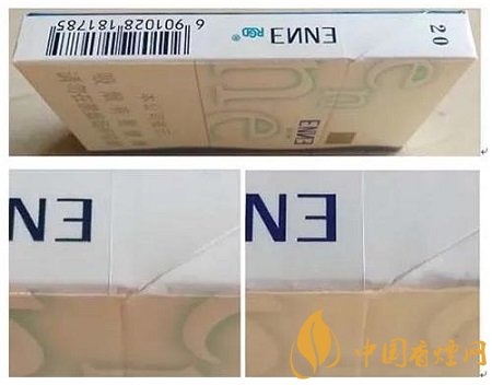 (4)真品卷煙“enne”小寫字母筆畫立體感強。該款假冒卷煙小寫字母筆畫無立體感。