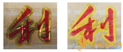 假冒卷煙:該款假冒卷煙激光全息防偽圖案暗淡無光,圖案無分層;兩側(cè)“三潭印月”都暗淡。上真下假