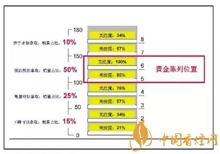 在同一組貨架上,因為顧客注視的方式不同,所以不同陳列位置產(chǎn)生的銷量會有不同的變化,一般來說,與視線平齊的位置陳列的商品銷量最高,而顧客需要仰望和蹲下才能注視的商品銷量相對要低。